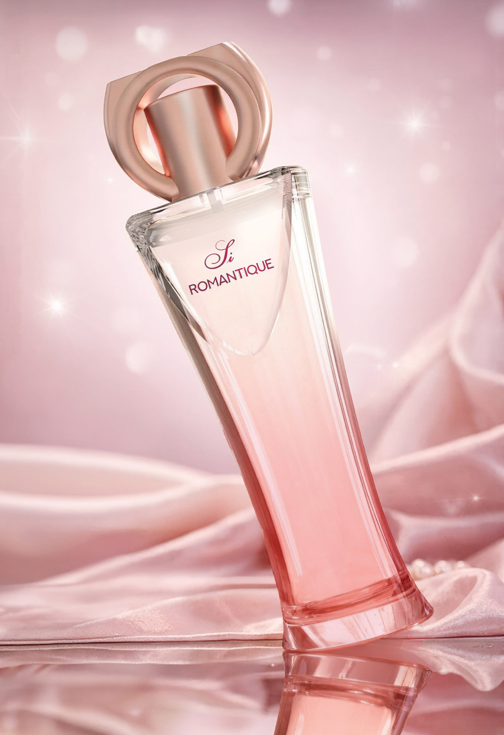 Si Romantique translates themes of love and femininity into a bottle defined by soft, flowing curves. Pink detailing accents the upper section of the tall, minimalist form, leading into a wraparound curved cap that gives the design its signature identity. The packaging was developed to mirror these contours, with rose gold foil adding a subtle sense of glamour and richness. This custom bottle and box were created for the West African mass-market fragrance market.
